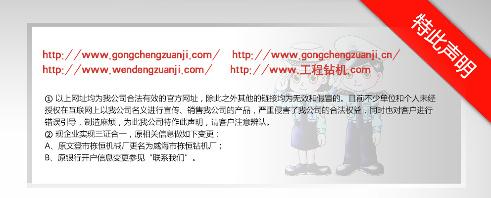 威海市棟恒鉆機(jī)廠隸屬于文登市工程鉆機(jī)廠,主要生產(chǎn)、銷售工程鉆機(jī)。它坐落于文登市西鋪頭工業(yè)園,這里科技發(fā)達(dá),交通便利,制造業(yè)集中。 自1982年建廠以來,經(jīng)過多年的優(yōu)化改革和沉淀積累,擁有精密、大型加工設(shè)備近百臺的生產(chǎn)企業(yè)之一。現(xiàn)在研制成功的GJ-400、GJ-250S、GJ-250A、GJ-240S、GJ-240A、GJ-180S、GJ-180A型等鉆機(jī)。在其它產(chǎn)品上,企業(yè)建立了長期、中期、短期的發(fā)展規(guī)劃,一系列的高性能產(chǎn)品正在不斷推出中,企業(yè)應(yīng)市場需求對系列產(chǎn)品進(jìn)行了優(yōu)化組合,開發(fā)了與之對應(yīng)配套的三腿、四腿單天車輪、雙天車輪鉆塔;泥漿泵—BW-160Q、BW- 200Q型球形閥泥漿泵大大提高了泵的使用性能和機(jī)械效率